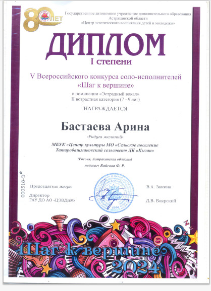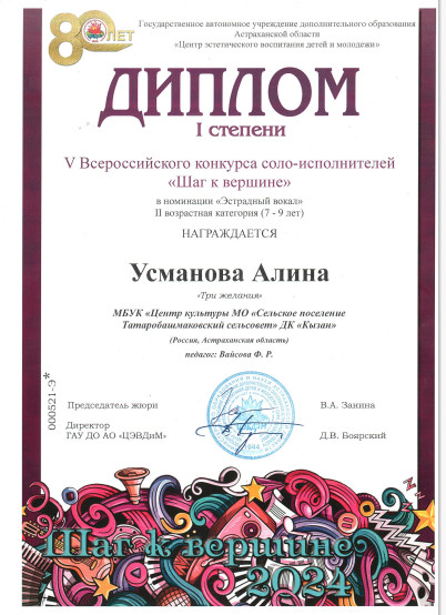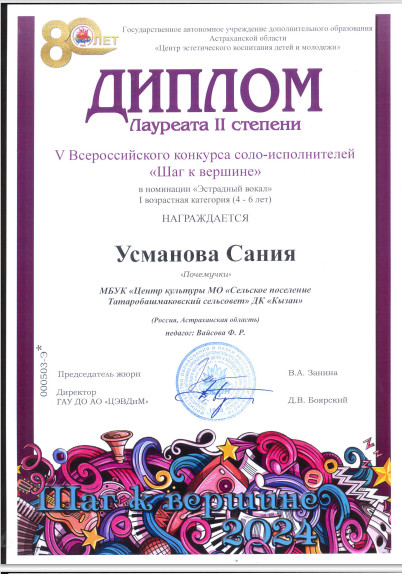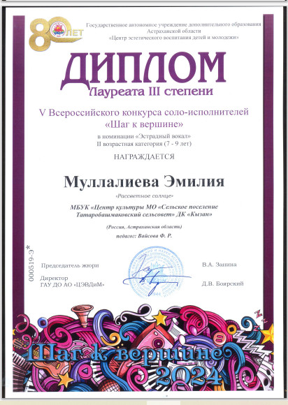 В номинации "Народно-стилизованный вокал"- Маннапова Самийя стала лауреатом 2 степени, в номинации "Эстрадный вокал": Усманова Сания - лауреатом 2 степени, Акмамбетова Диана и Муллалиева Эмилия лауреатами 3 степени, Бастаева Арина и Усманова Алина - дипломантами 1 степени. Поздравляем наших девочек, родителей и их руководителя Вайсову Финзия Ринатовну. Желаем дальнейших творческих побед!