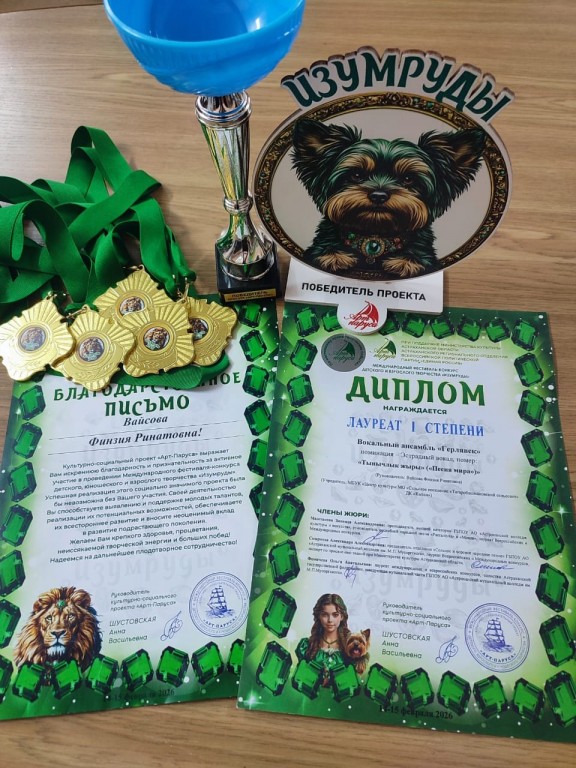 15 Февраля в Доме творчества "Успех" города прошел "Международный фестиваль-конкурс детского и взрослого творчества "Изумруды". Вокальный ансамбль "Герлявек" и юная солистка дома культуры "Кызан" Котенко Николь стала обладателем дипломов лауреата 1 степени. Поздравляем детей, руководителя Вайсову Финзию Ринатовну и родителей с победой.Желаем дальнейших творческих успехов.